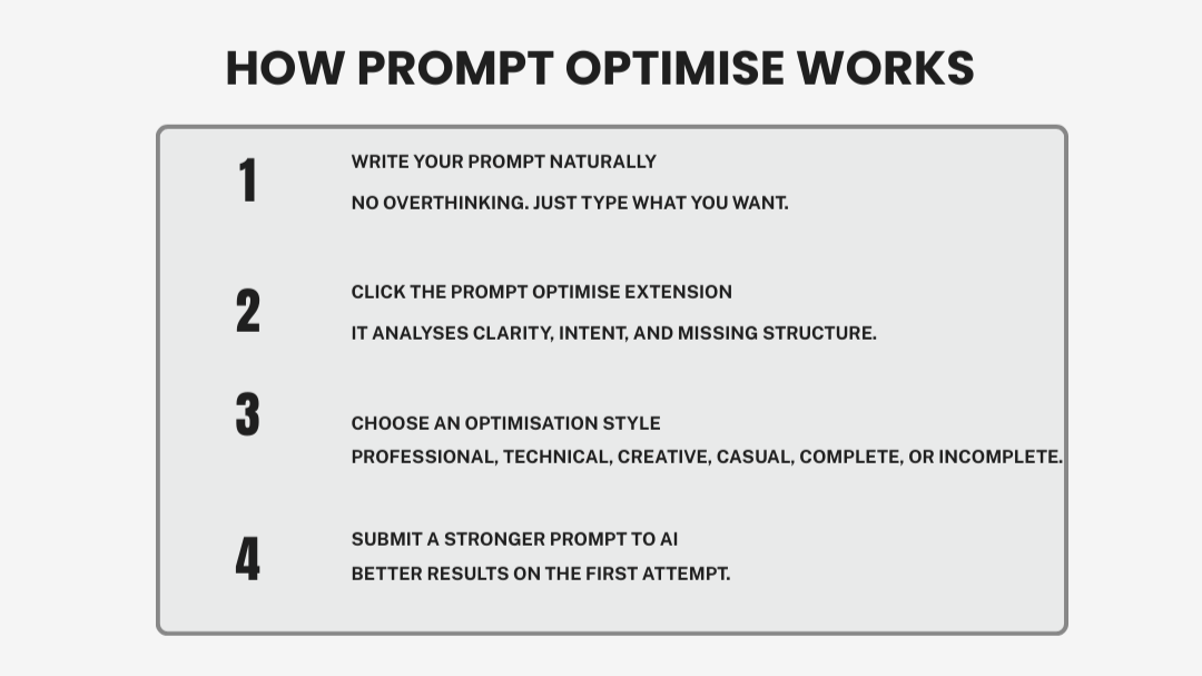 Rather than changing how AI models behave, Prompt Optimise focuses on the most important variable: the prompt itself.